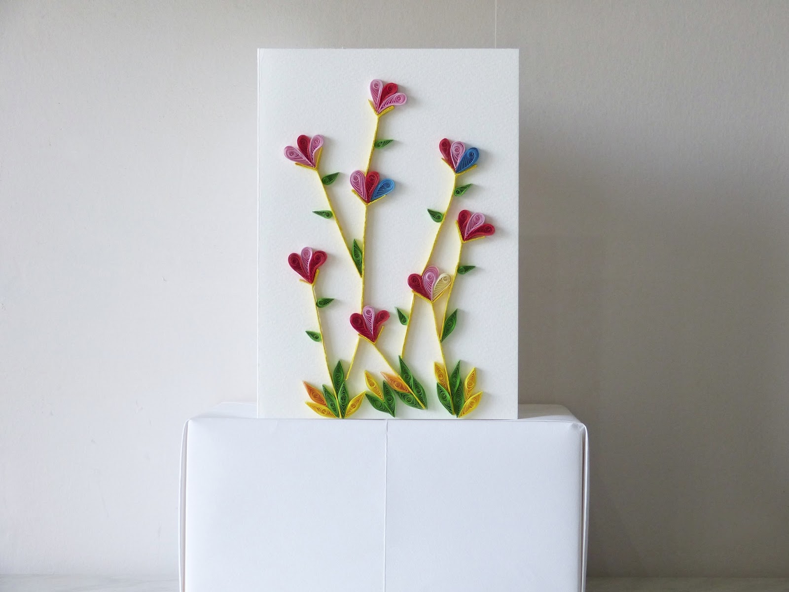 Here’s another card I made to thank someone. As from previous posts, I have continued the colourway, using my available paper. In this one, I thought I’d make some foreground grass-like foliage and made the leaves of the flowers smaller and daintier. I added yellow to the colour way, which I think, was a good idea (it added some zing and freshness). I think this card has a ‘wonky’, quirky look about it.