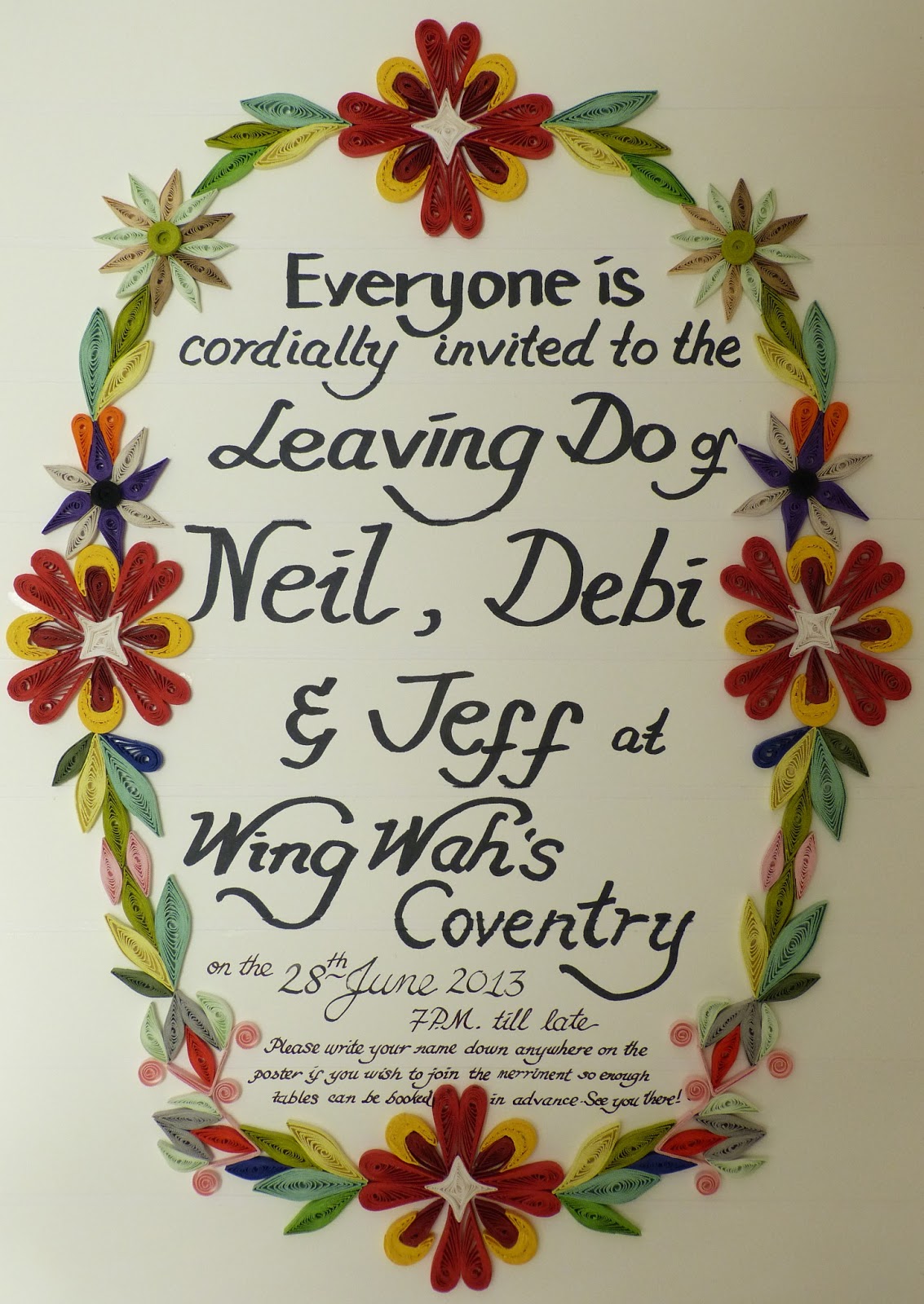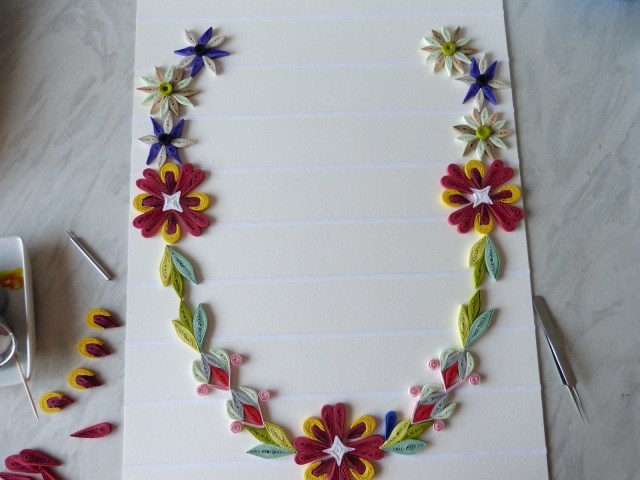 This poster was made for three colleagues leaving their current posts to go onto pastures new. One of them happened to be moi. So to mark the special occasion, I made a poster for the three of us as we are celebrating our leaving party together. The quilling work on this scale took 16 hours in total but done in a gentle, ‘taking-all-the-time-in-the-world’ kind of way. The best way to work (I think). I made some petals in all sorts of different shapes and came up with four main floral combinations. See below for the build-up of the quilling work. I decided to arrange them in an oval shape to contain the text announcement. I added a small touch (done in advance) of a hint of white horizontal lines, using white quilling paper against the textured background of the 300 gsm paper I used for the support. The poster is getting rave reviews at work, which is highly motivating and fulfilling, indeed.