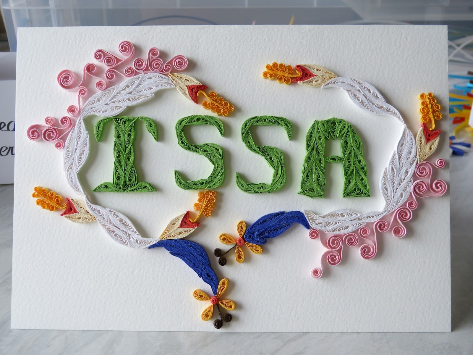 I quilled this Birthday Card for a friend who turns 35 tomorrow. She had her birthday party celebration yesterday, well in advance, so people can all come. It was full of laughs and gaffs, and we all had a blast. This card was a free style design, intended to evoke colours that a girl would like, but also to capture a bit of the summer feel as the sun was shining when I made this. Those little yellow stamens were a joy to make and happen to be an accidental discovery (when I was trying to find out the quickest way to do it). The brain just kinda took over and I started folding the strip of paper several times till you have a ‘bunch’ in alignment. You glue together the strips on one end (that is, their tips after cutting the fold line to separate the bunch). Then the other tips (8 in total) are free (once cut) to be coiled into neat little ‘anthers’. I am definitely beginning to like this botanical feel in my work and would like to develop it more. Happy Birthday to my friend, Issa!