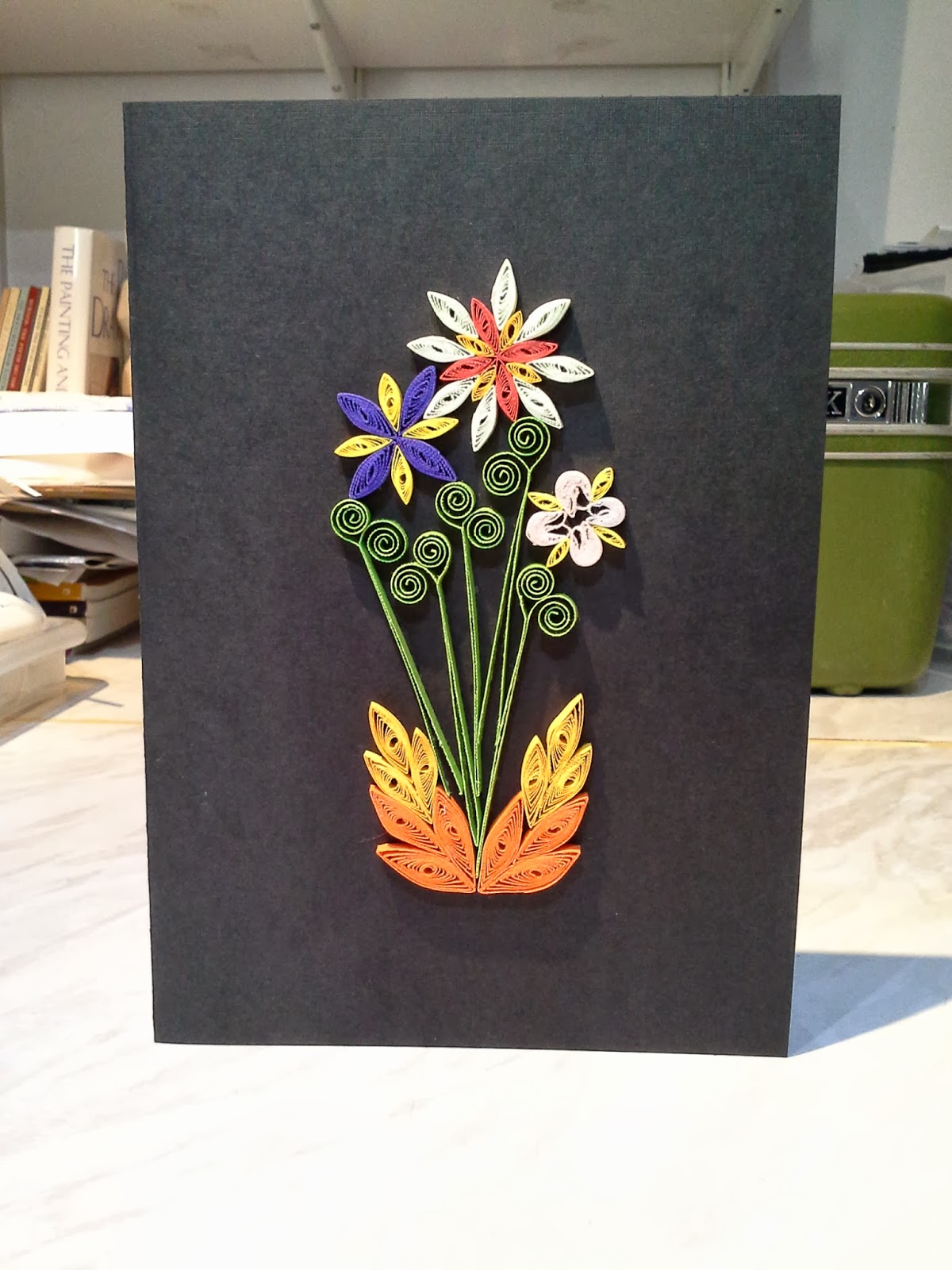 This little creation was a birthday card. I had a few of these black thick paper (probably 300 gsm) with a linen press effect. I thought why not compose an Ikebana arrangement of flowers and make them pop out against the textured paper? Man, Heaven and Earth with a bit of poetic license.