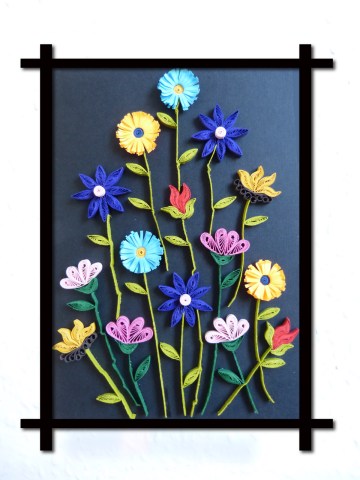 The weather seems to herald spring already. This year I wanted the folly flowers to be nocturnal. In Asia, there are flower species which bloom at night and are specially fragrant.So I thought why not use what’s left of my black linen-pressed-effect paper as the background for this tableau. For some reason, in the resulting photo the orange flowers (dandelion-like ones) have acquired a yellow tinge. Happy spring cleaning, everyone!