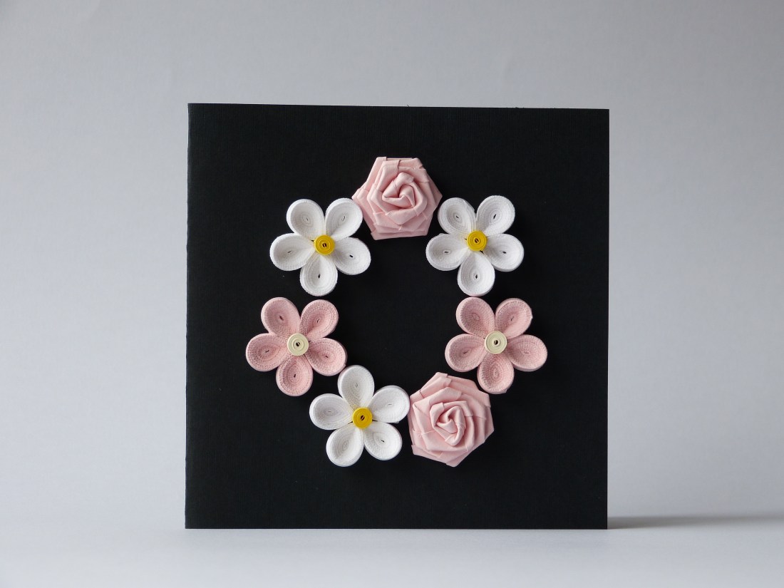 This is another concoction using almost a polygonal arrangement with the flowers. This time, I wanted to keep the flowers natural looking by folding a rose. The white flowers seemed to work pretty well as an off-set triangle. This was just an accident, of course, no distinct design here, just random play and see what worked best. I should, perhaps, use more black, as sometimes, it does create an elegant mood with subdued colours.