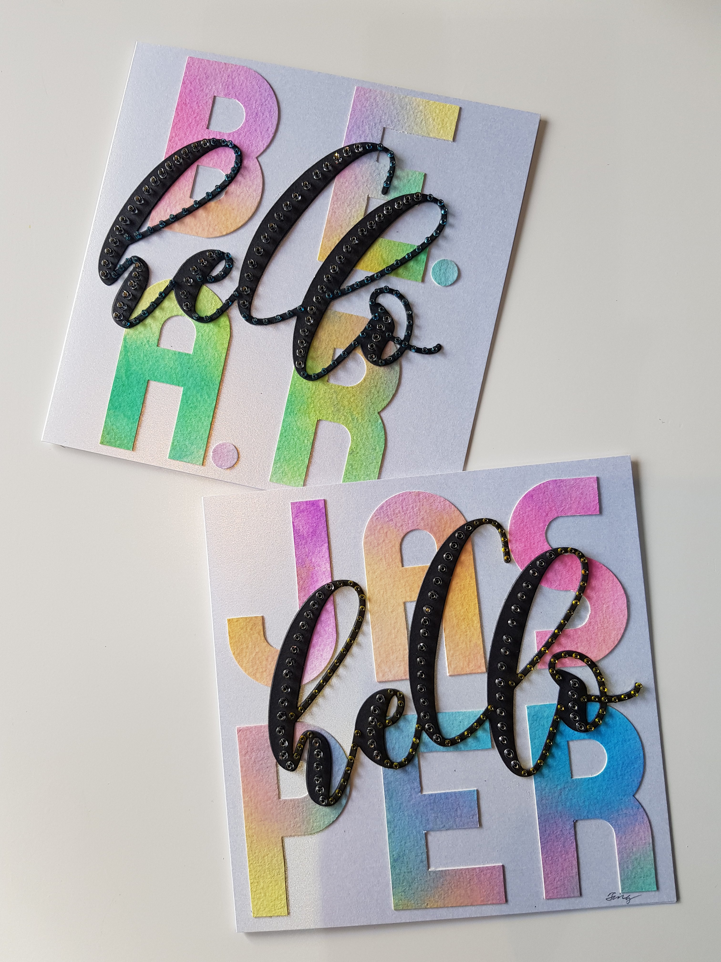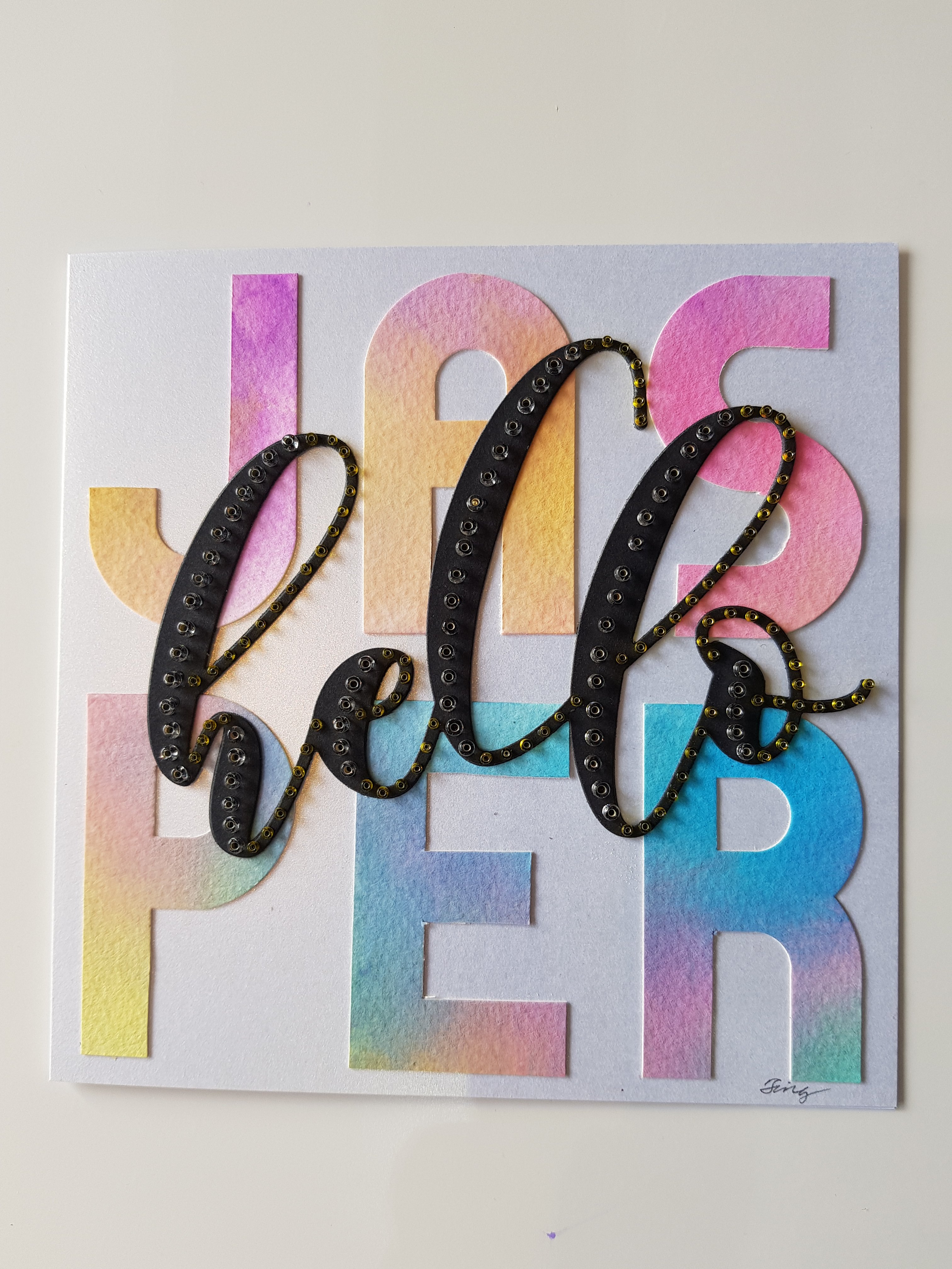 I forget what die the “HELLO” was made with, as I don’t really habitually file my dies in an organised way (maybe I should). It’s a deep black regular cardstock that I’ve layered three times to produce a certain dimensionality. I then chose a two-colour bead configuration following the text contours. I thought it needed this as the last flourish to make the whole card come alive. And voila! Welcome to the world B.E.A.R. and Jasper!