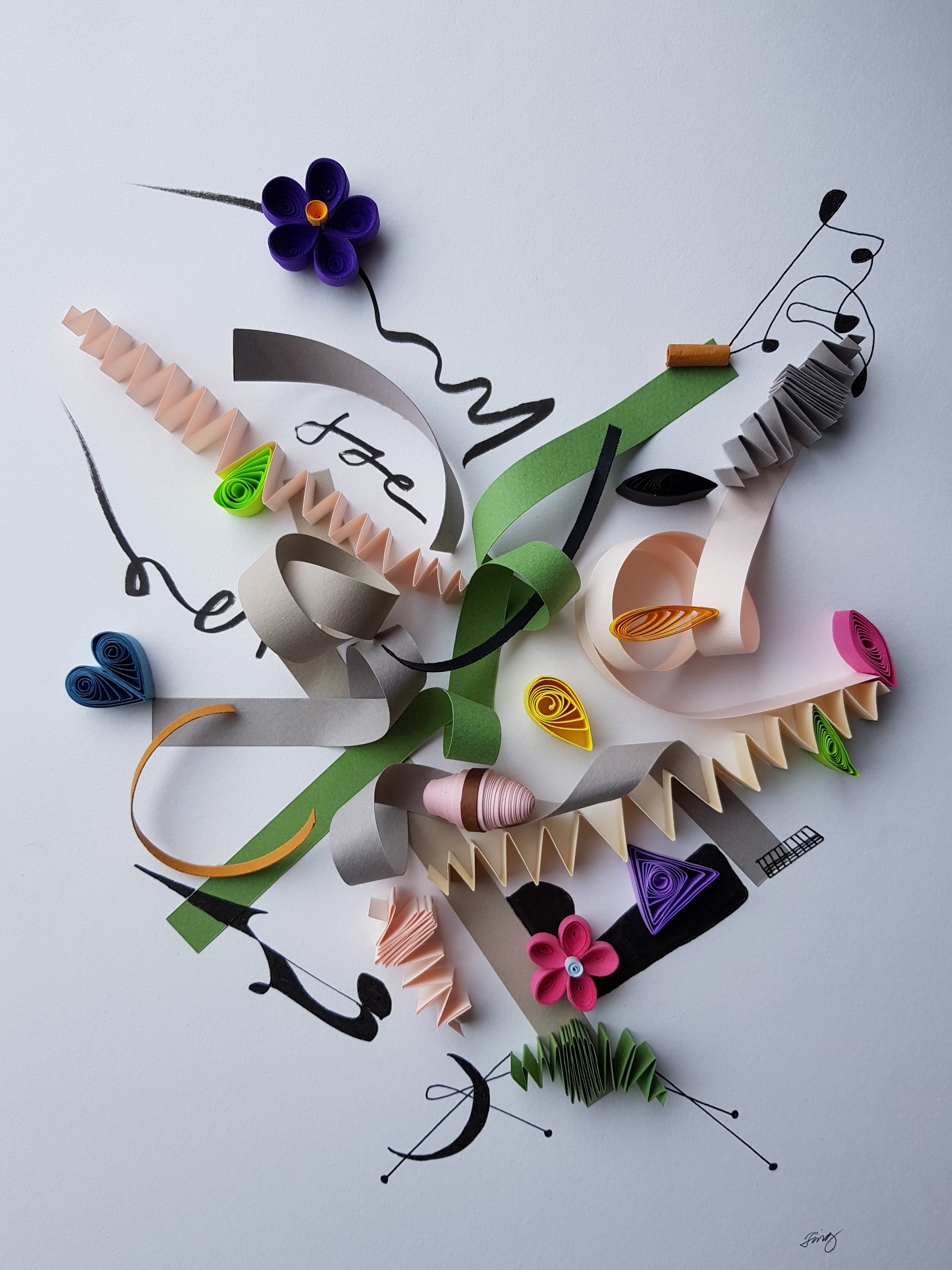 Thought about mixing pleated papers with coiled and ‘bendy’ ones. The juxtaposition of these two methods was the starting point. Then it became about how the papers cast subtle colourful shadows on the support. Played with several ‘arrangements’ and finally decided on this offering, which reminds me of restaurant food. So my inner gastronome is bubbling out of my ‘unconscious’. My favourite moment here is the ‘peach-yellow’ yellow shadow on the right side. Who knew that paper could create such delicious reflections?