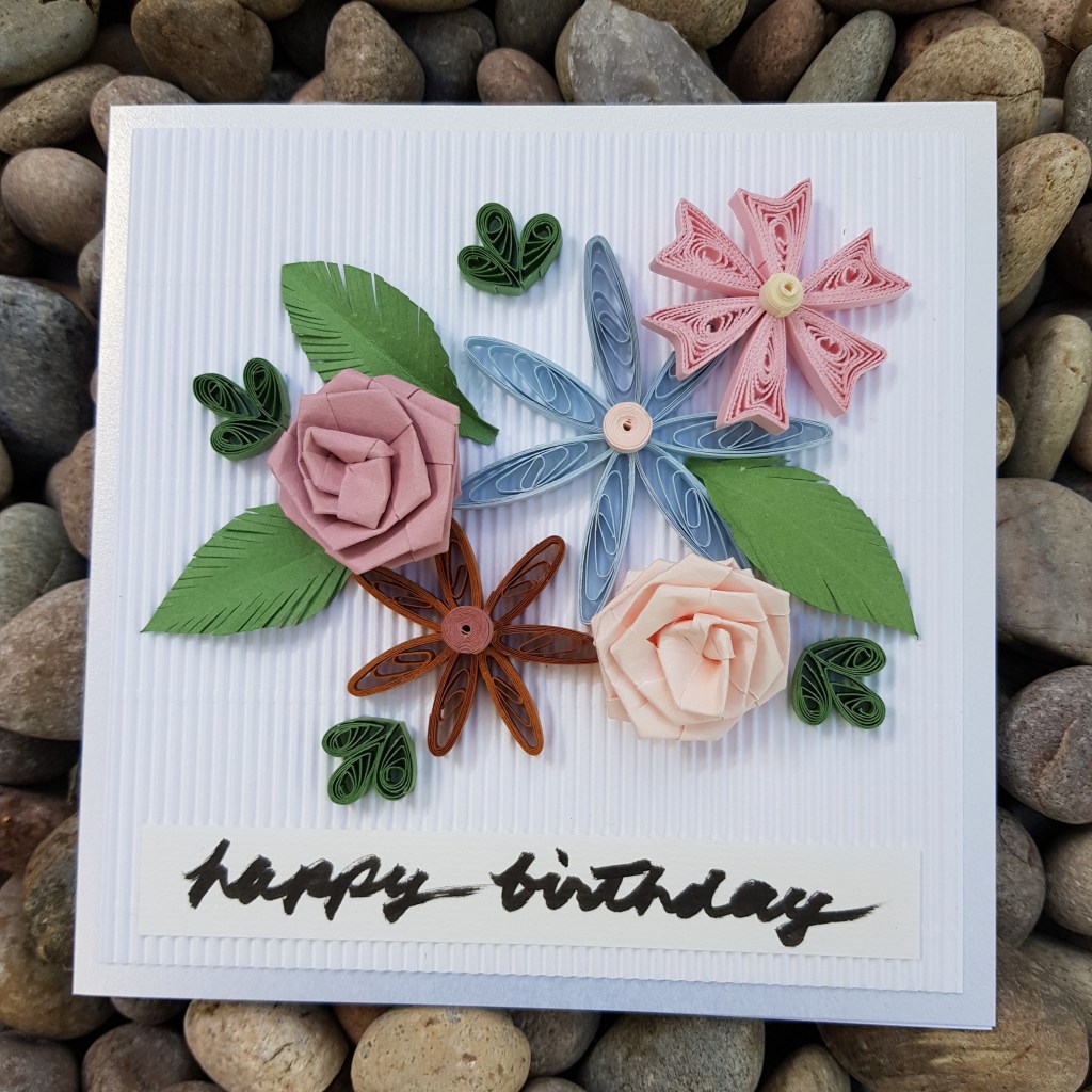 The sun had a particularly strong light when I made this card and my early roses were starting to bloom. Hence, this rose card for a fantastic lady who deserved a birthday treat. I am also showing here some fringed leaves. Not done this for awhile. Simple snips, really do add a subtle dimensionality. Note to self – must do more fringed leaves. Finished the whole thing with the greeting using a Copic brush script pen. There is another potential project lurking in this technique, which I shall explore in due course.