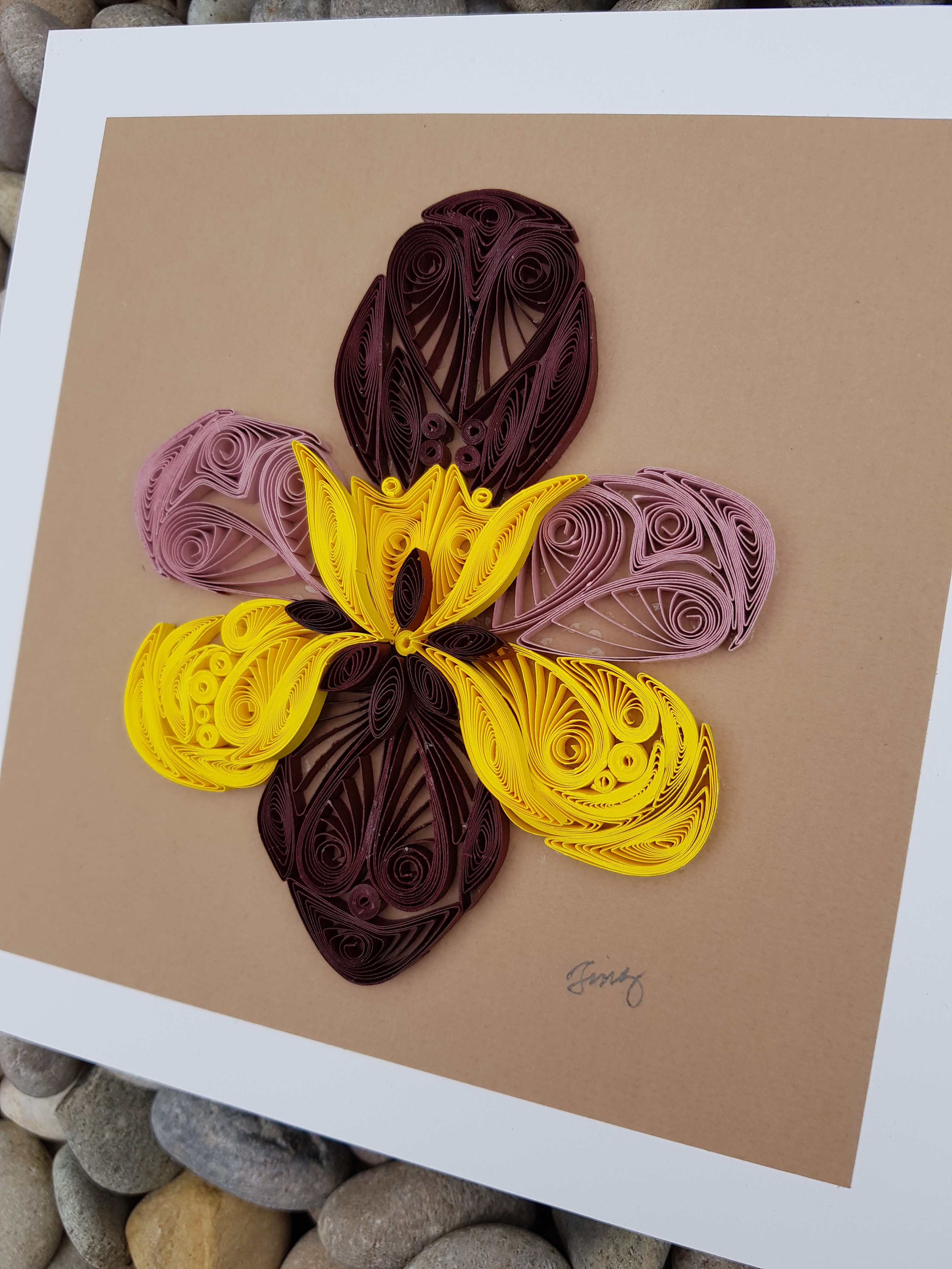 This work only measures 18 cm x 18 cm but it is a labour of love. It is an imagined one – a sketch from memory or imagination, if you like. I don’t know if there is such a cultivar in these specific yellow amd plum, but if there is, it is going in my house!