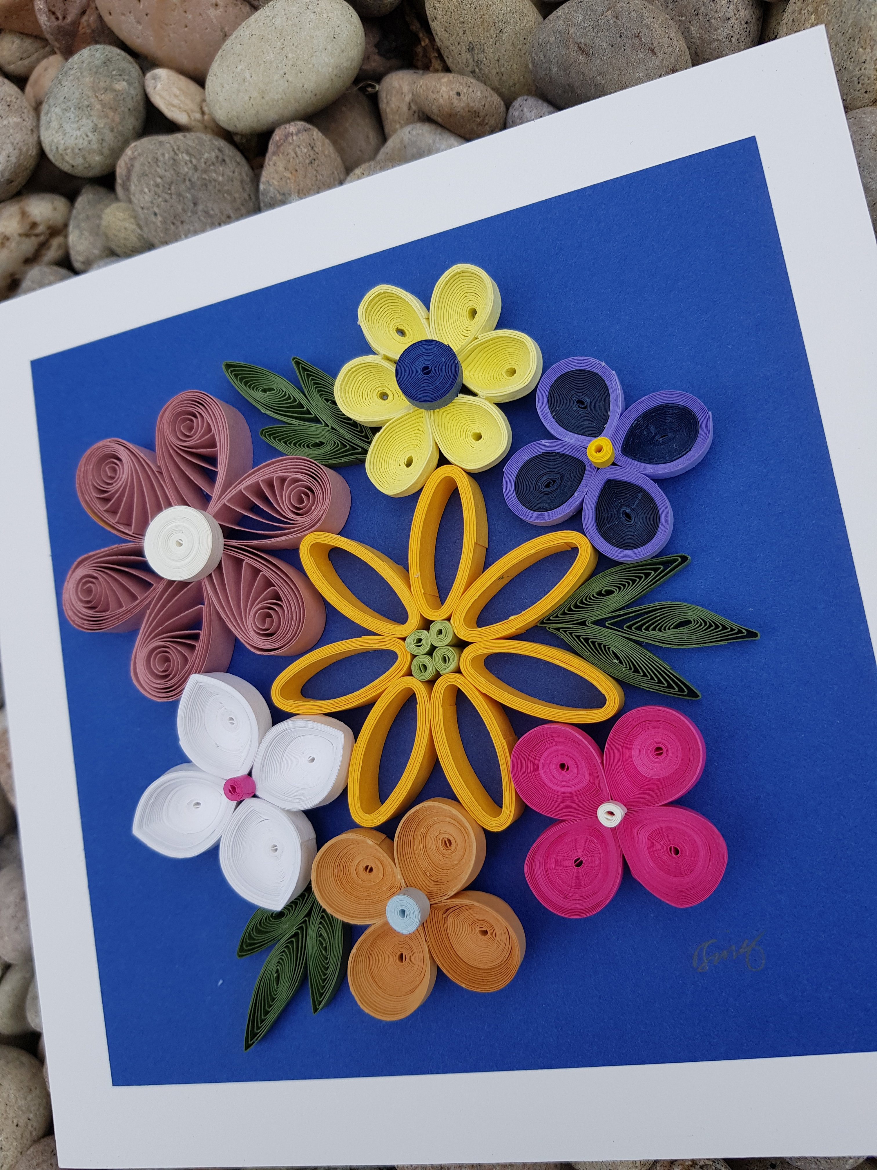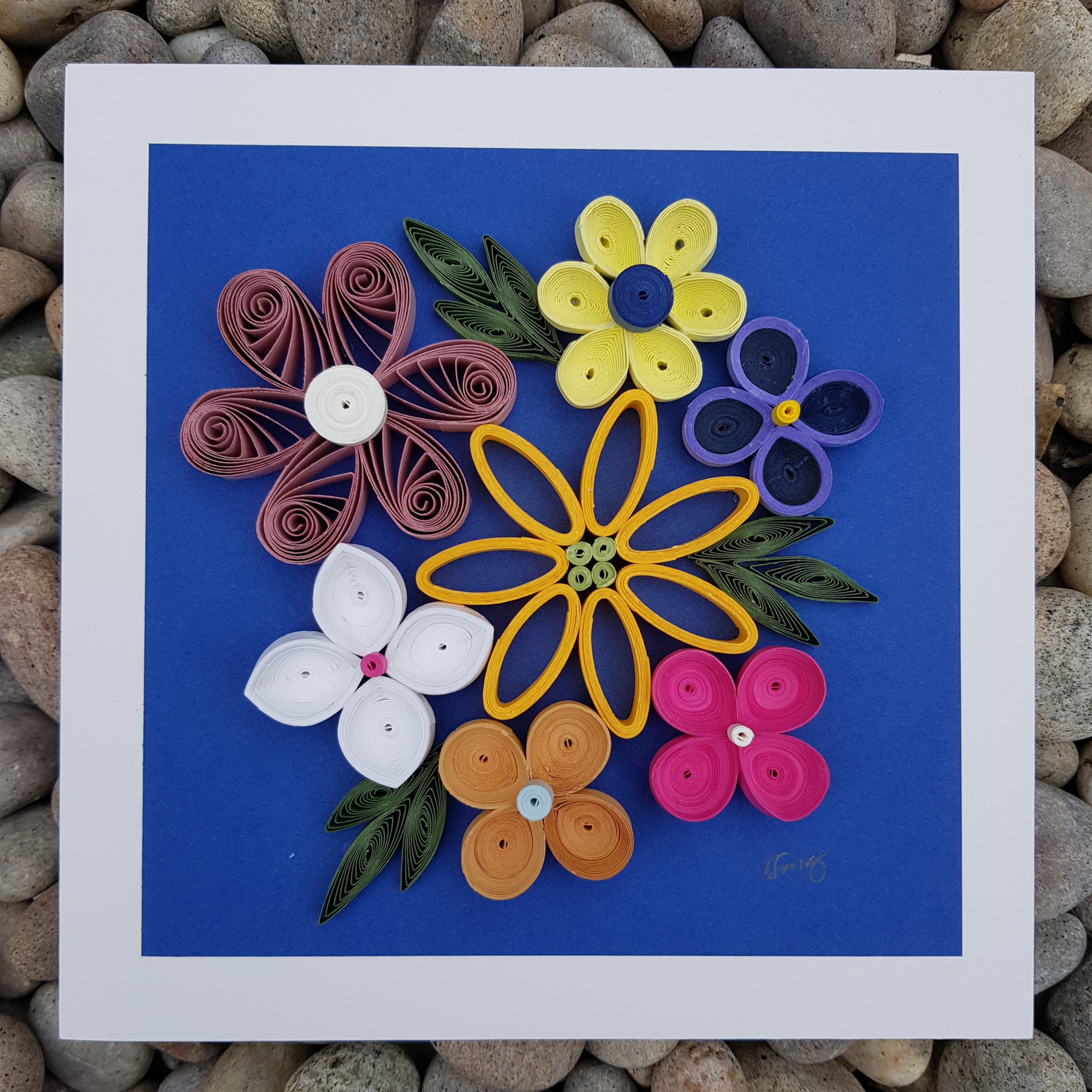 Finally, I am reprising a six-petalled flower in pink. This type of flower construction was so common in all those 1970s craft books I pored over in my teens. I used to make just these shapes overlayed on a watercoloured card. It is made by gluing together six teardrop quills around a central motif on top. If you are also into crochet, you would perhaps understand me if I say that this shape is the granny square of flower quilling. It is a timeless classic.