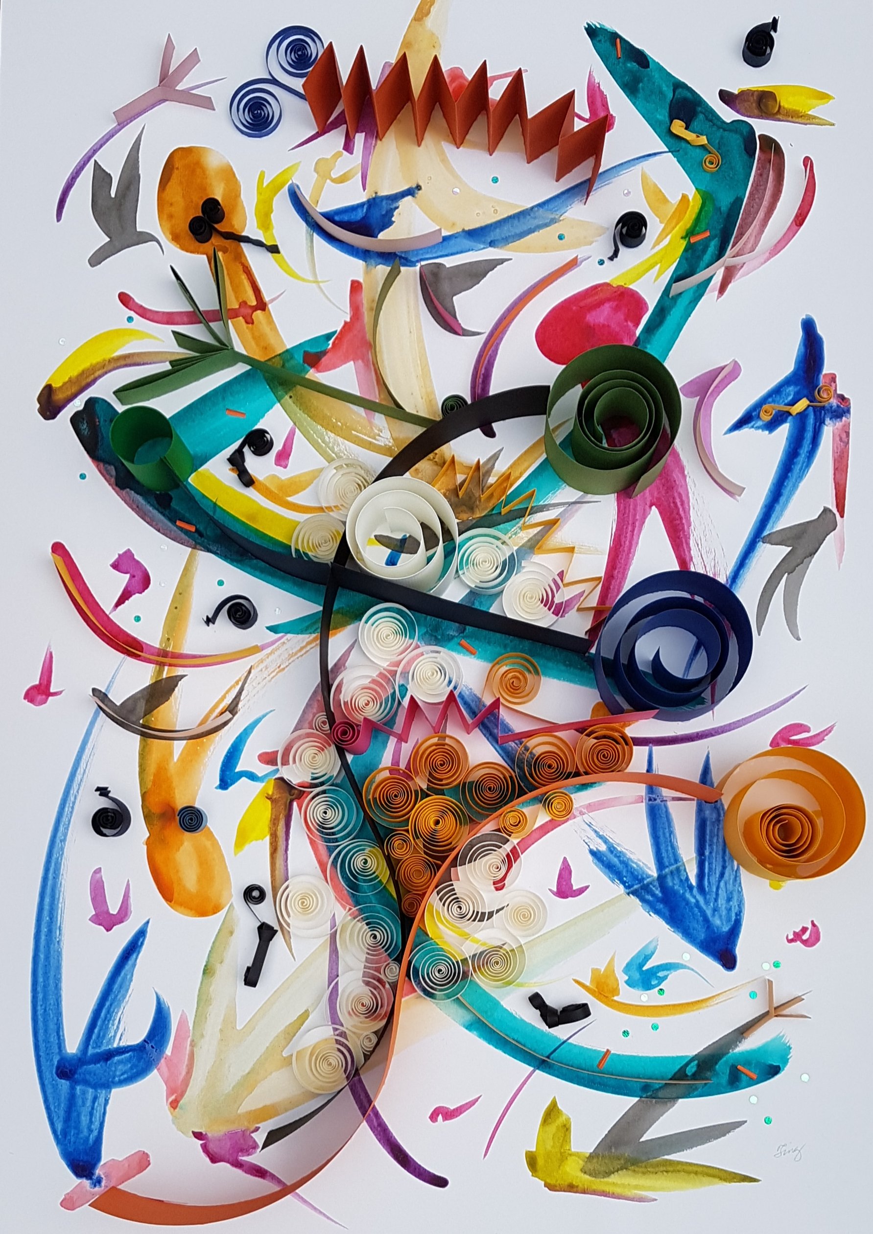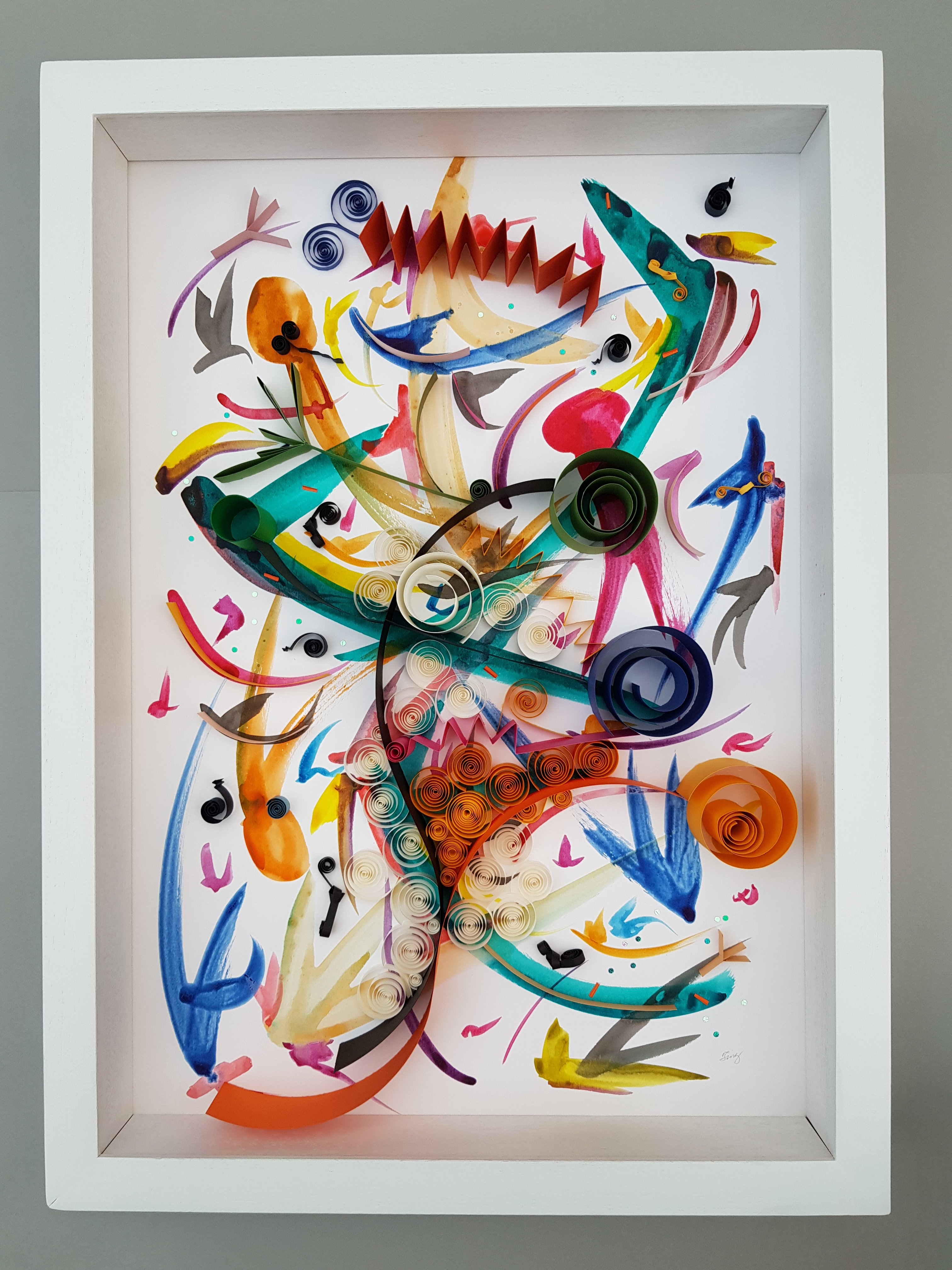 I thoroughly enjoyed making this, however, as the watercolours and quilling meld together as a new and original hybrid. Watercolour simply has that evocative quality that can capture aquatic or ‘wet’ things. I have added some medium to the watercolour making it ‘wetter’ and really making the brushes do the work. I will be delving into this technique some more. I like how its is figurative and at the same time expressive, abstract and spontaneous.