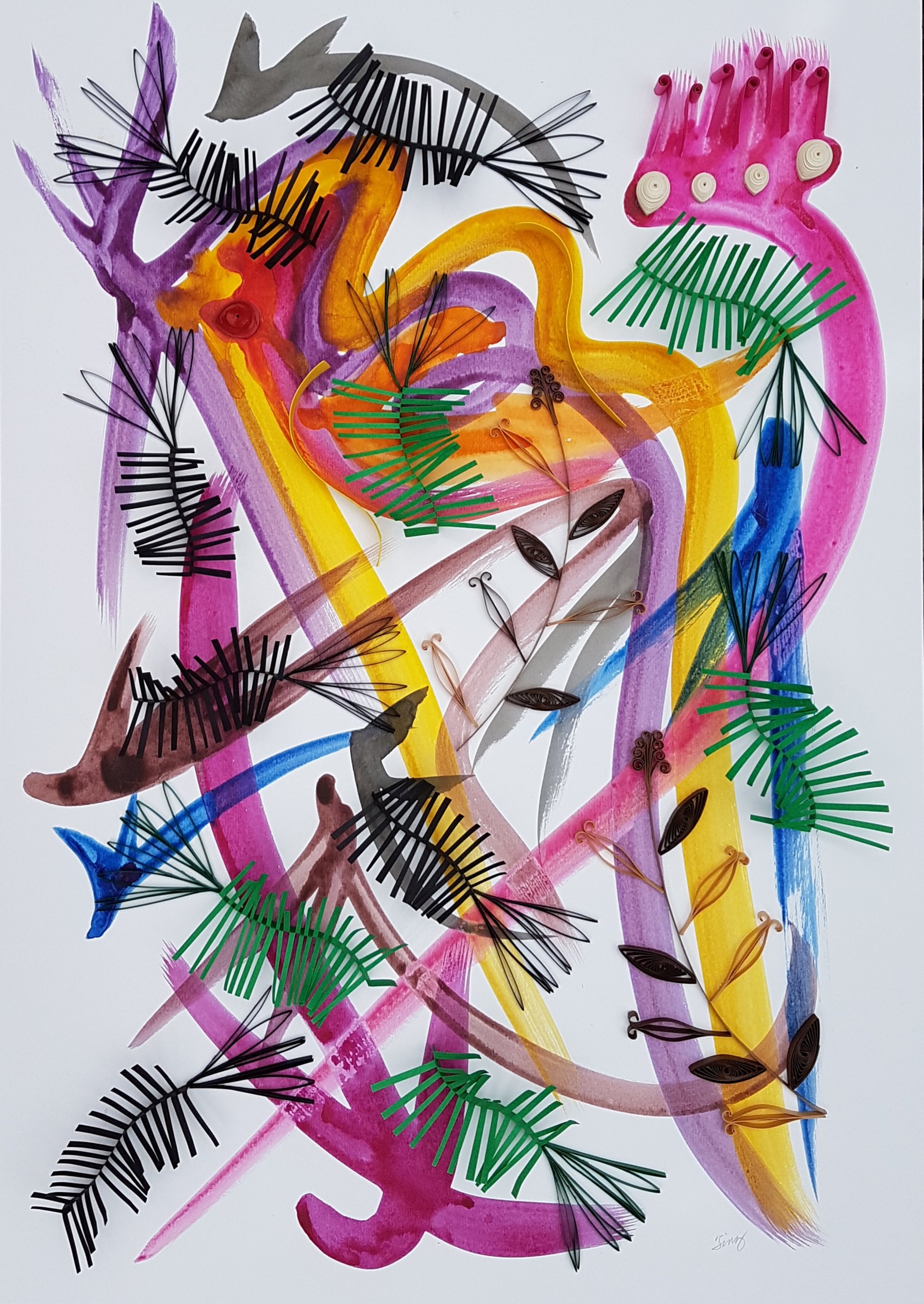 This was an experiment in colours that are quite tropical and vibrant. It seems to have a ‘visual dance’ element, which I like. Also, I am starting to achieve some recession in some elements, some middle-ground and foreground. The paper fringeing was a happy accident, made with two elements joined together. They seem plant-like to me, but their shrimp-like tails say otherwise.