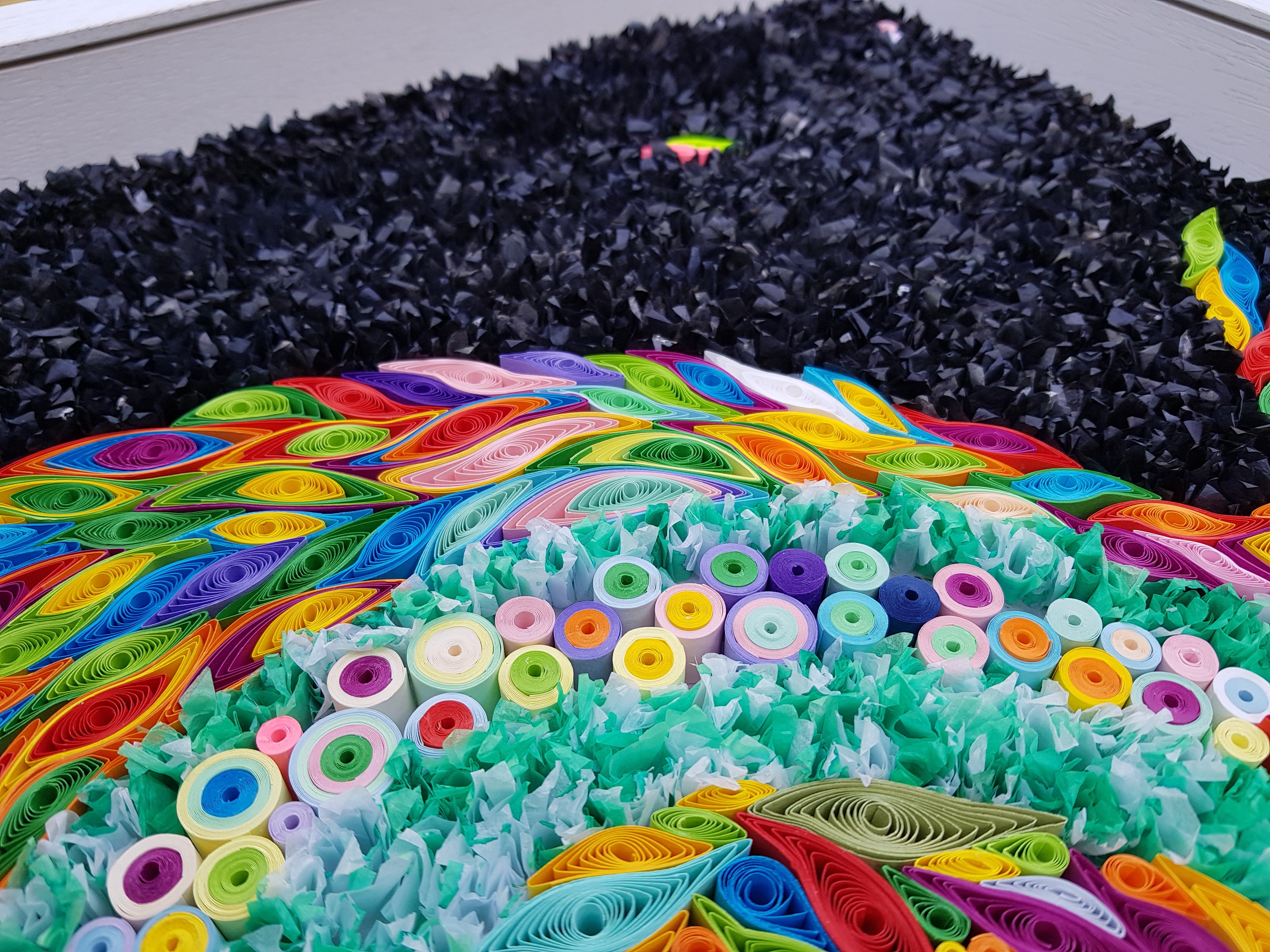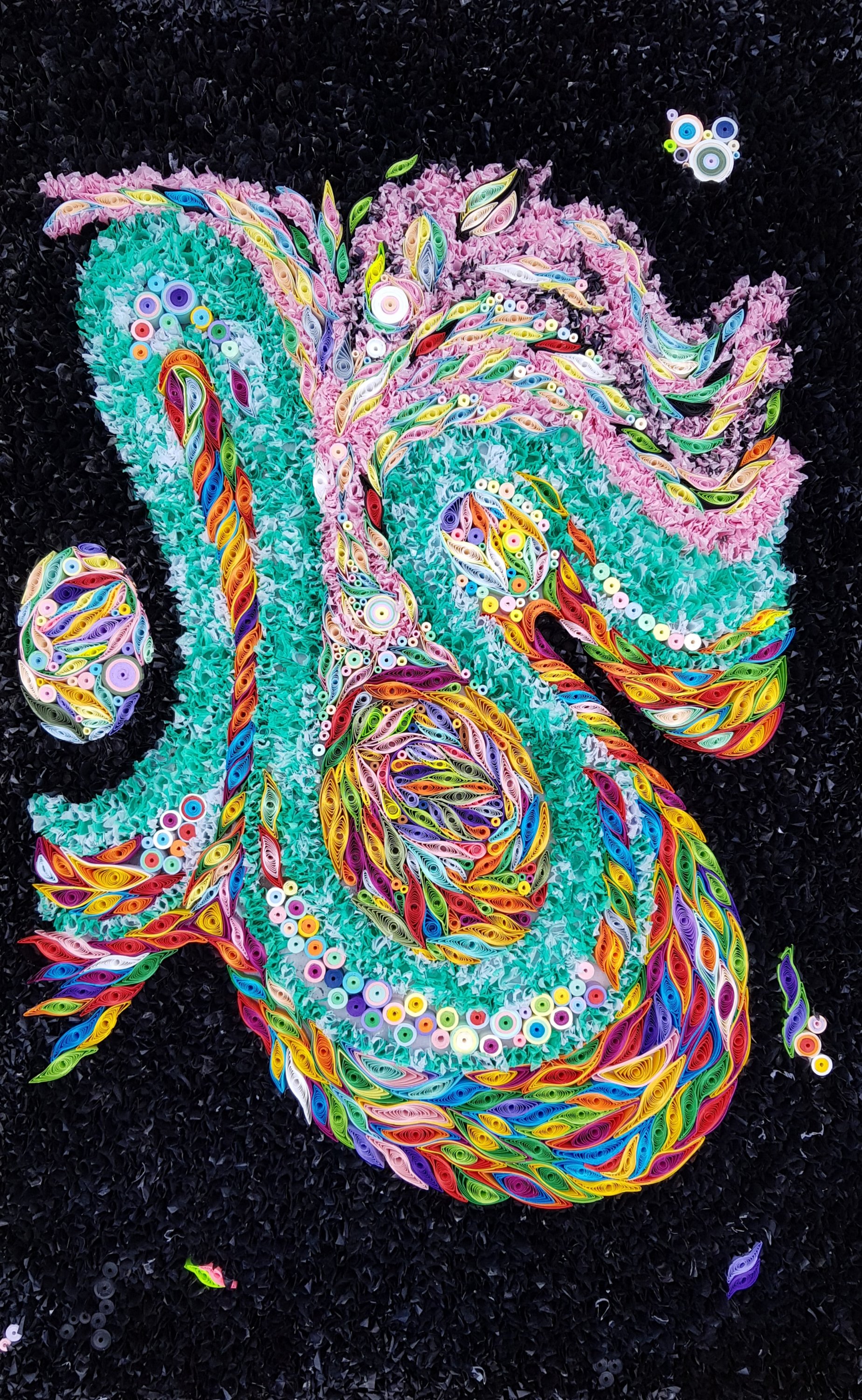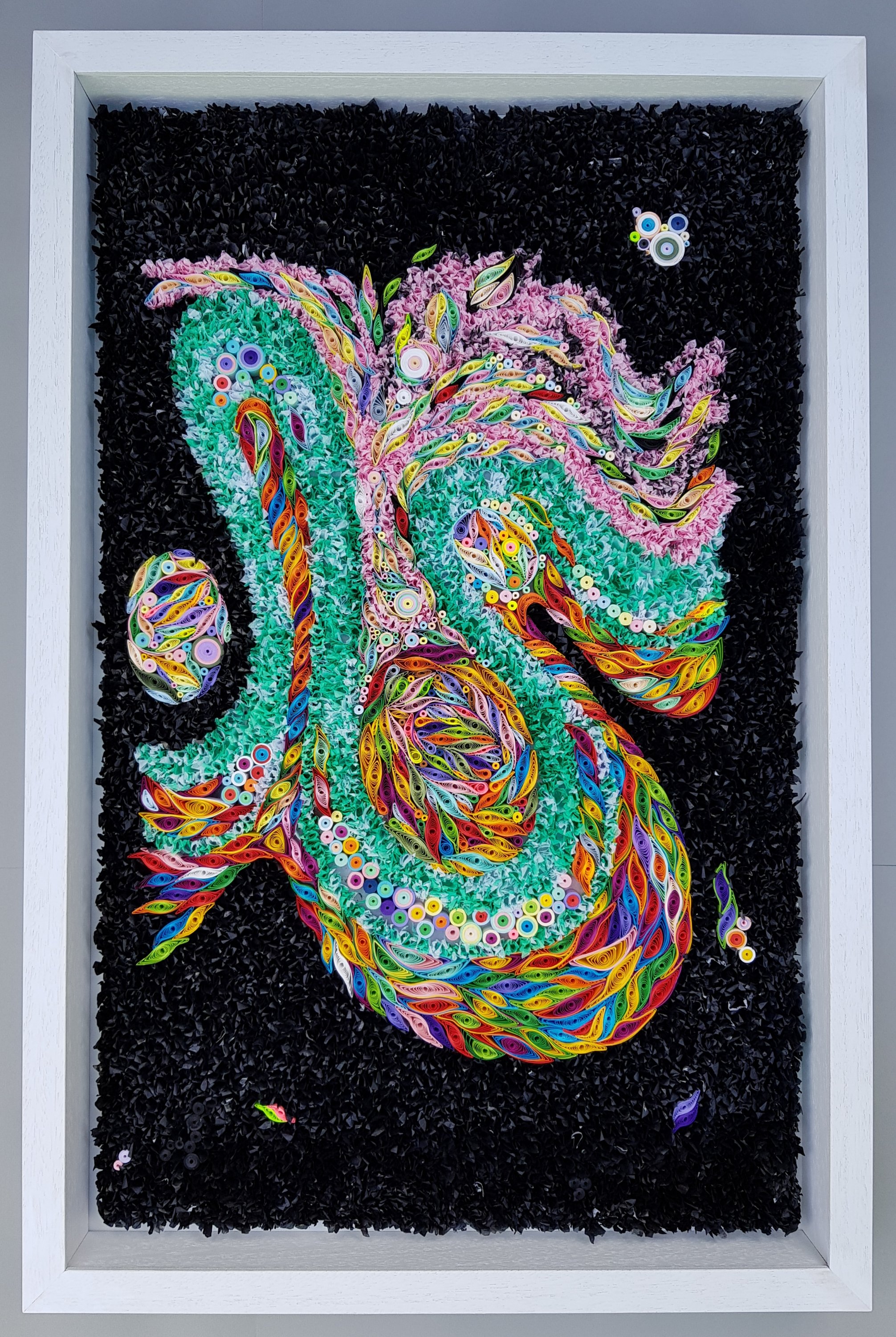 Here are some detail shots. Subjectively, I intended the colours to move somehow against the inky black. The quilling “wave” work seems to achieve this. I suppose this effect is inherent to the “coiled and released” nature of the paper, and it is one of the subtle surprises that I like about this age-old craft.