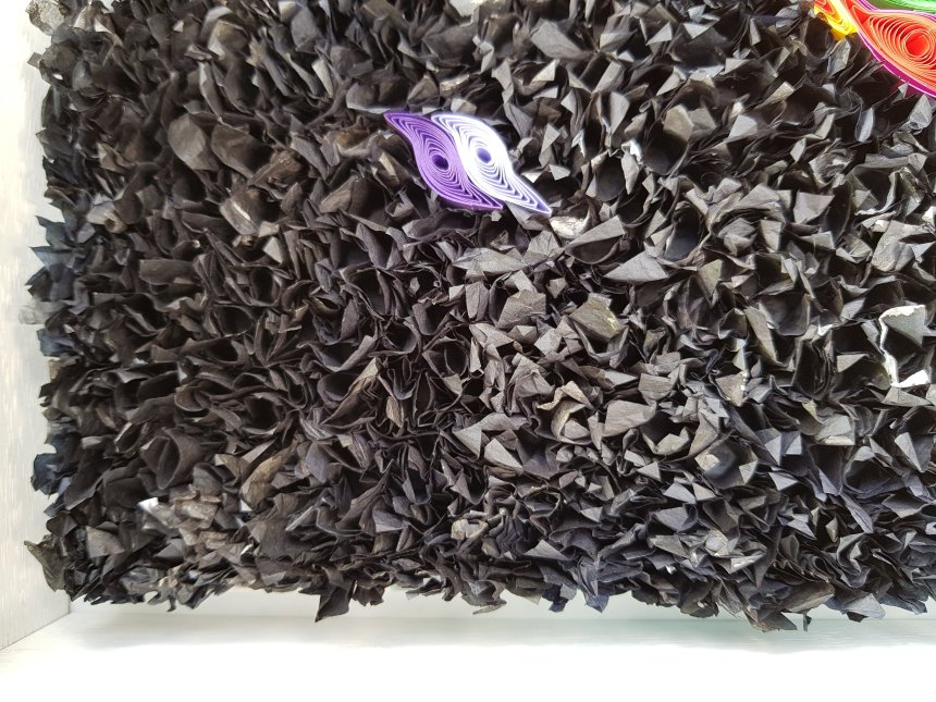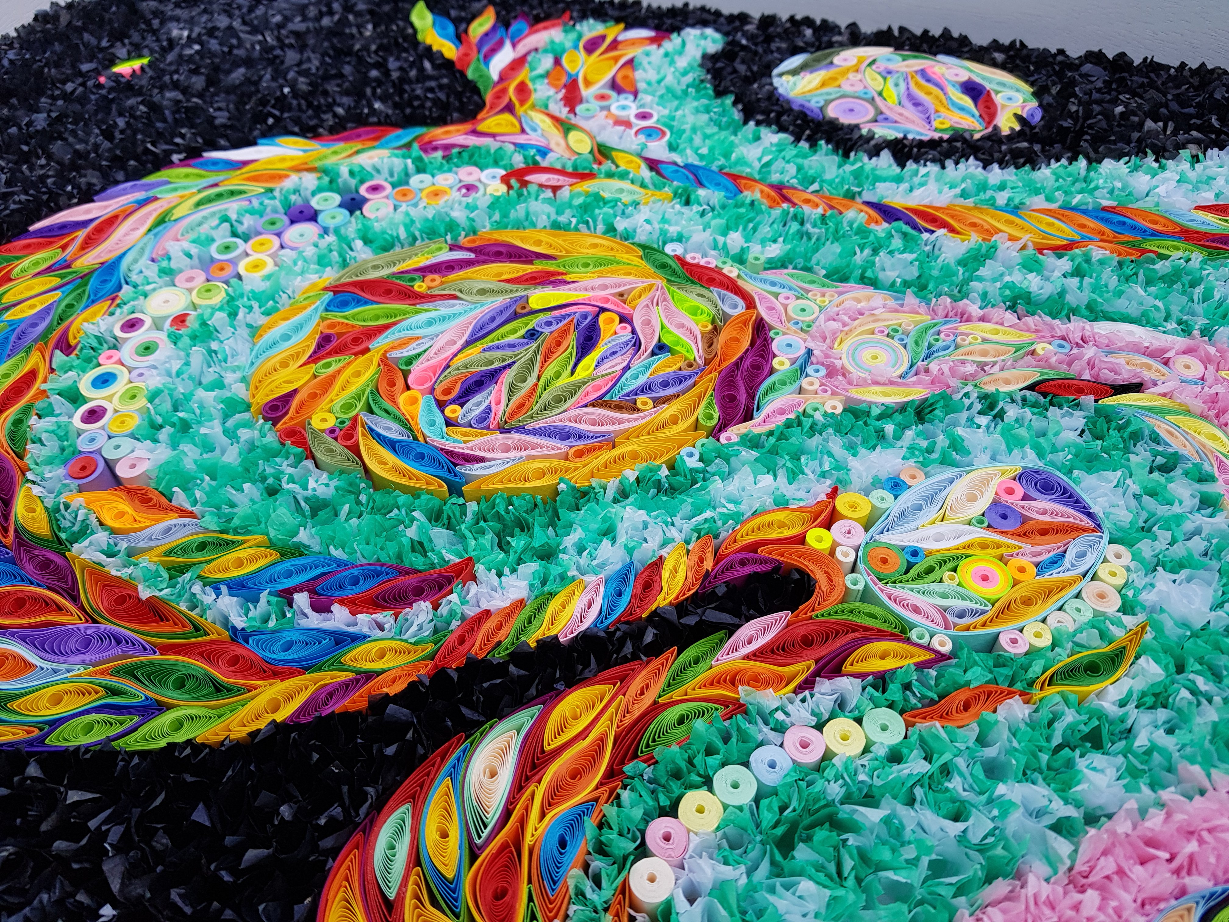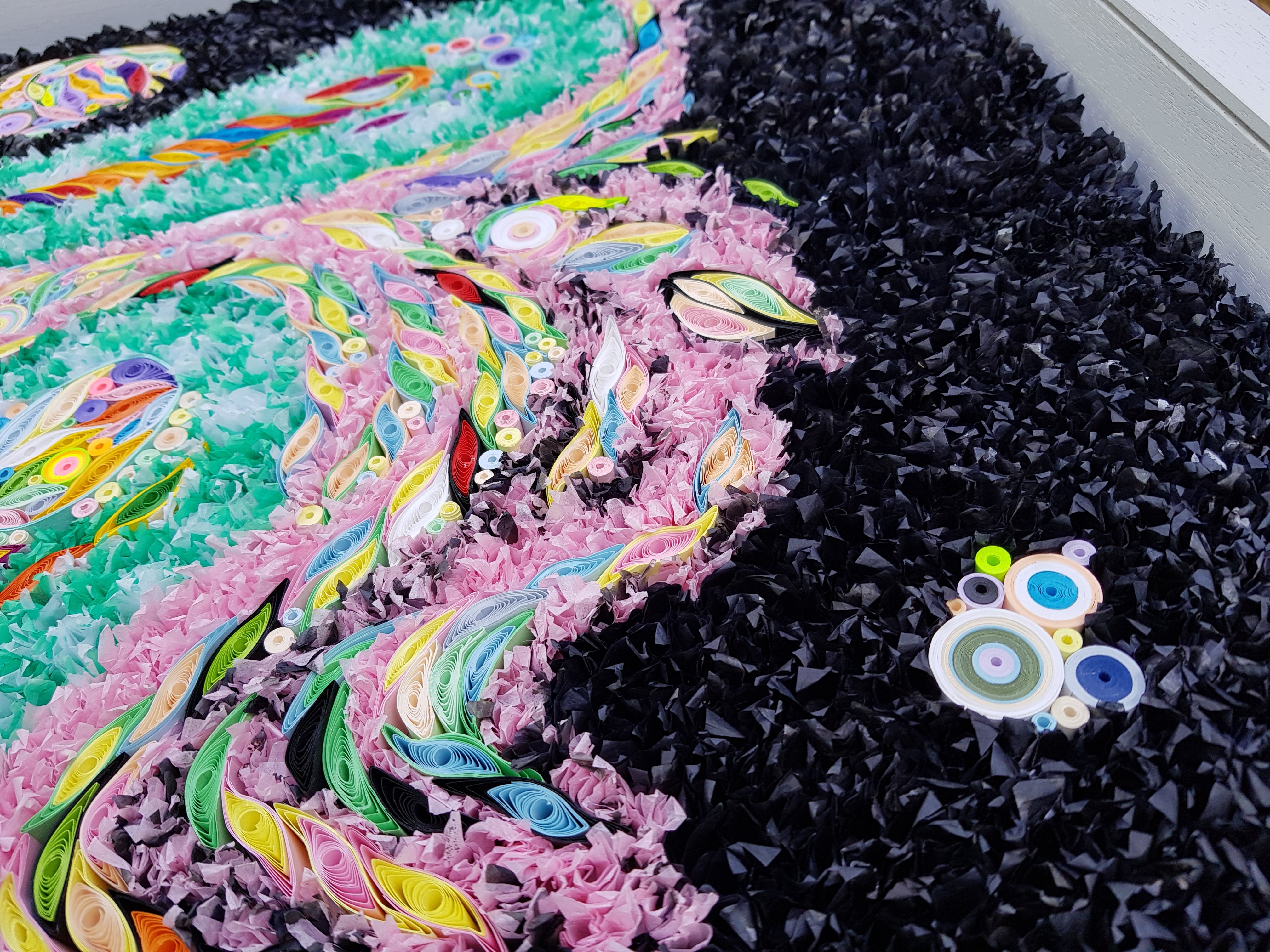 This piece measures 58 x 80 cm, by far my biggest work, which took approximately 500 hours of quilling and tissue work. I hand-painted the tissue in sumi ink to get a very deep black. Other parts have a greyish tinge. Then, there are also the green parts (which are in light-fast watercolour).