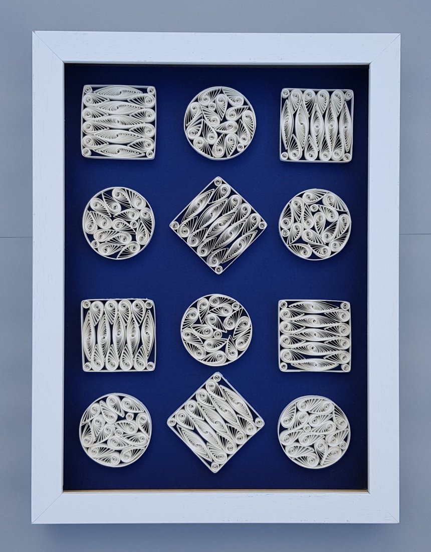 Measuring 29 x 29 cm, this was about playing with traditional quilling shapes, encasing them in circles and squares. The squares in particular are actually more rectangular, than square. This led to experimenting with how best to arrange them. I came up with the one above, which looks off-kilter in a way because the elements are rotated in different ways.