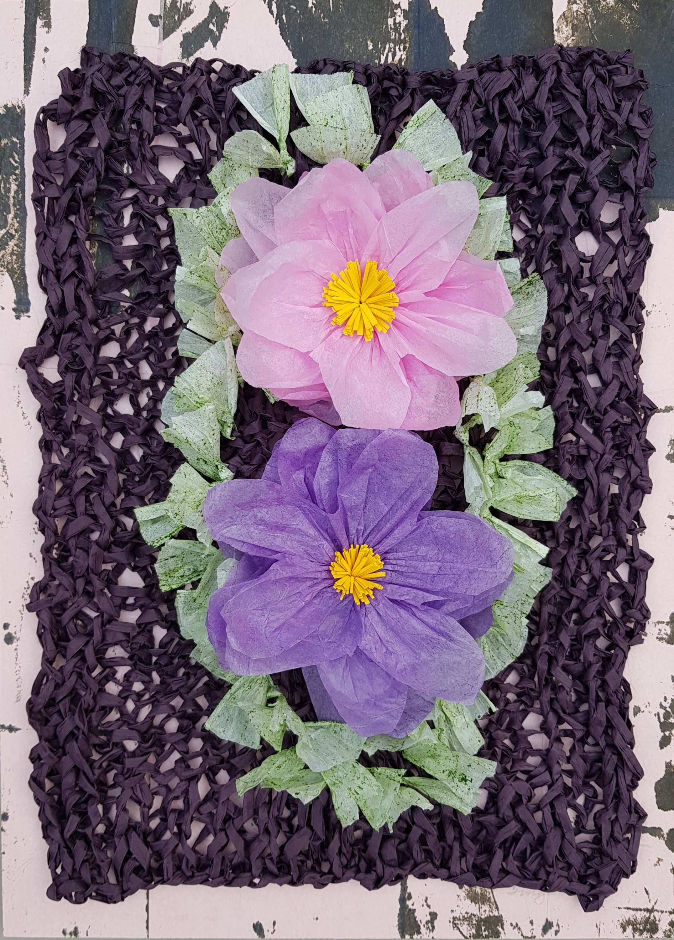 This is the fourth piece in the sequence from last December’s Wild Wonder show. It measures 29 x 40 cm (unframed). I was nostalgic about the tropics and, hence, the idea of making a kind of floral offering. The backround is an ink wash. I made a knitted fabric (with paper yarn) and anchored my ‘offerings’ onto this.