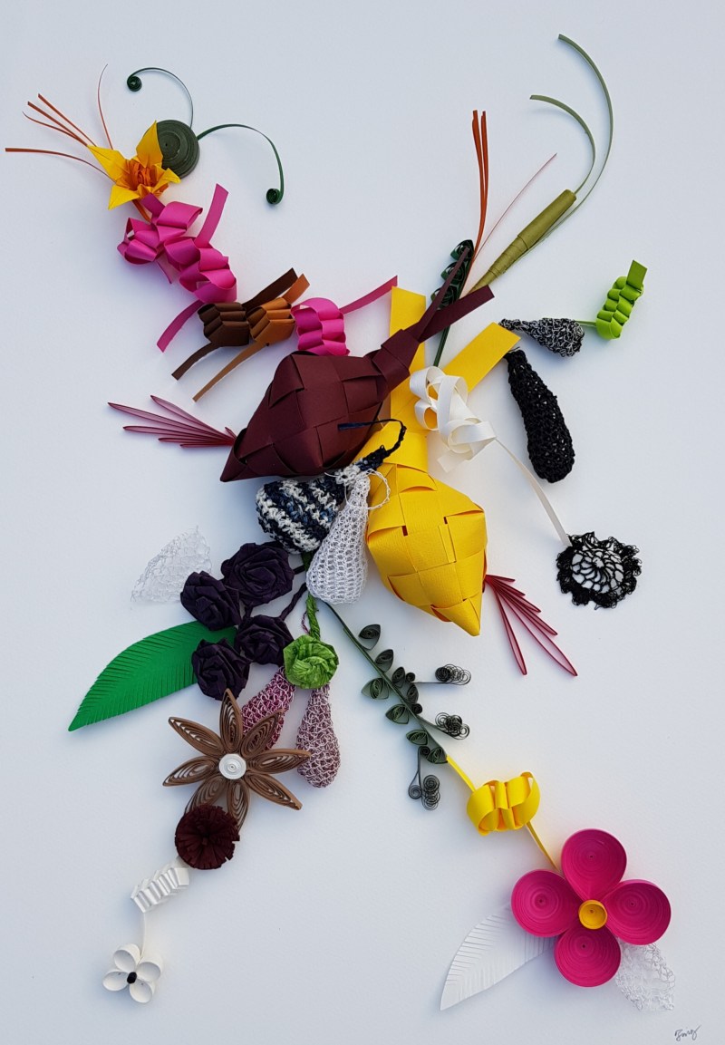 Hello again. After the Christmas hiatus, I am continuing my art stories. This is the fourth piece in the sequence from last December’s Wild Wonder show. It measures 29 x 40 cm (unframed). I was nostalgic about the tropics and, hence, the idea of making a kind of floral offering. The backround is an ink…